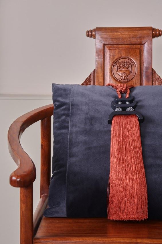 我們依據(jù)梅花窗的圖案,設(shè)計了兩款帶子,搭配窗簾和抱枕,把江南唯美的文化氛圍,通過與布藝的結(jié)合置入中式家居。
